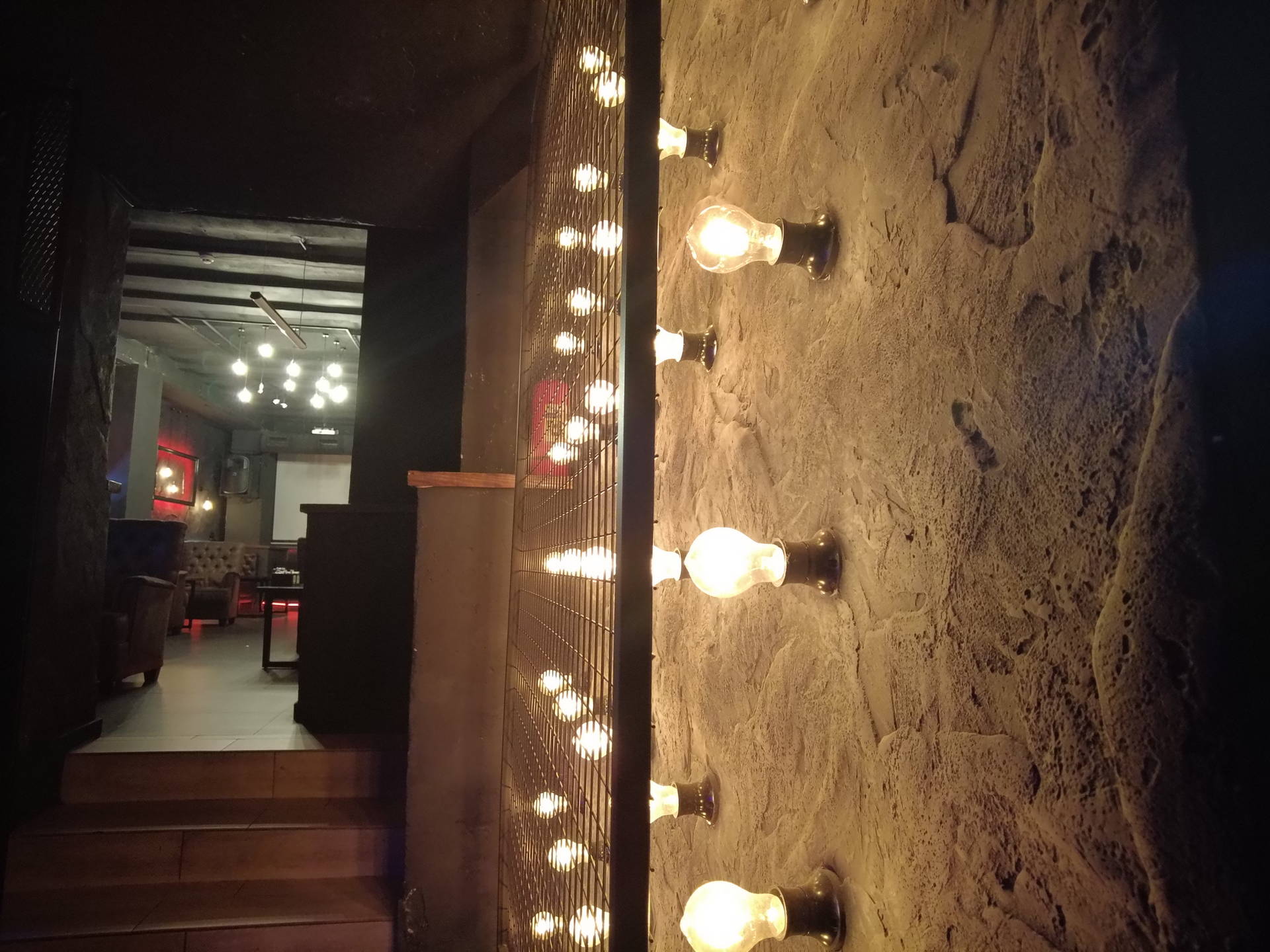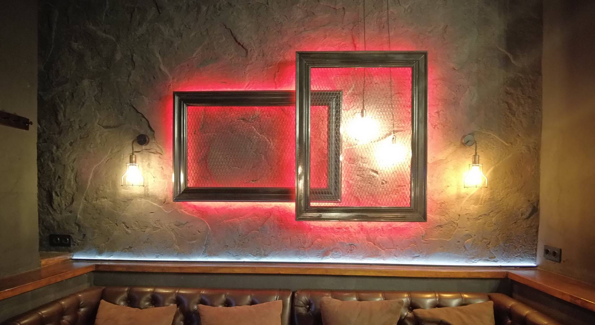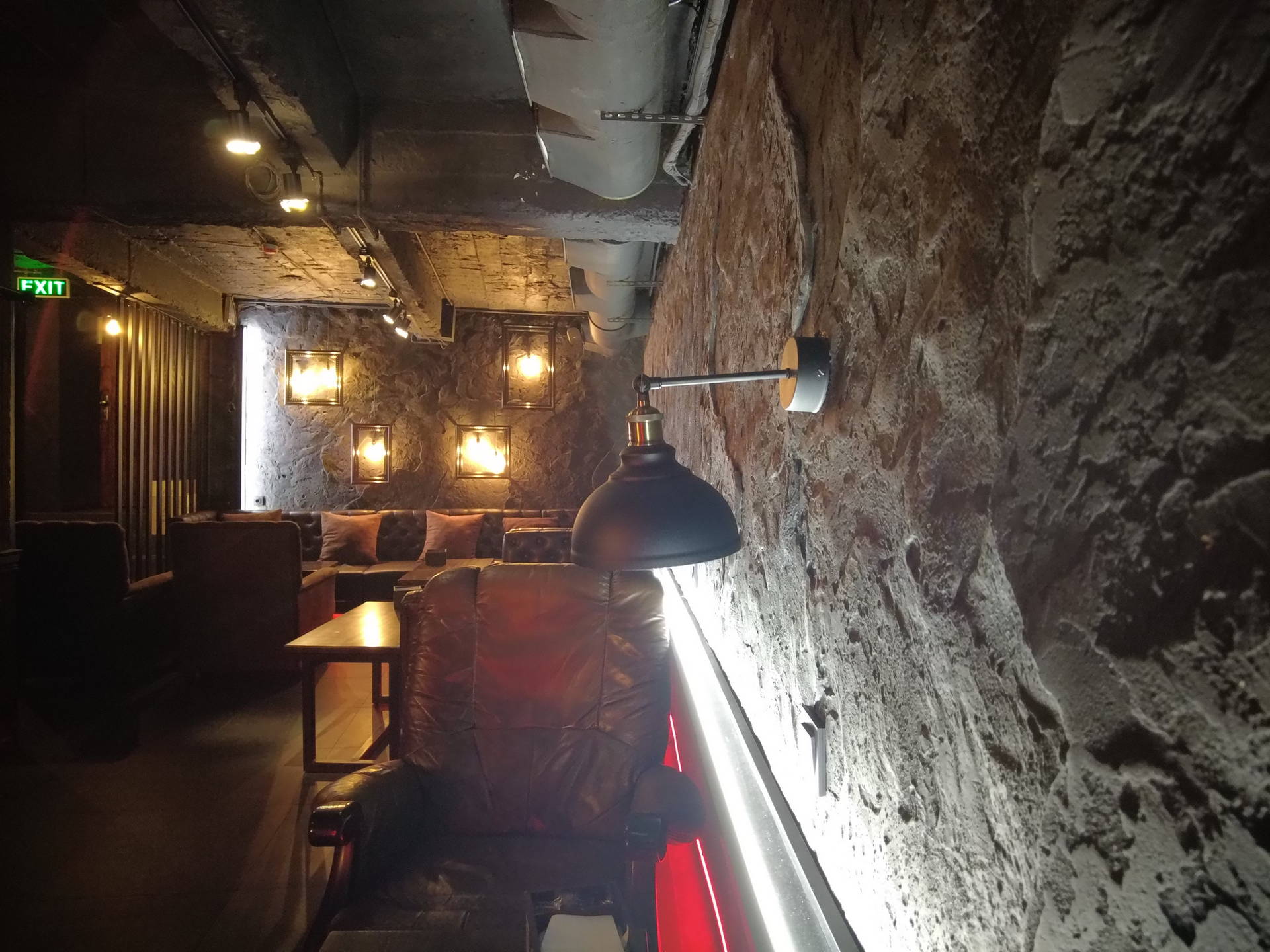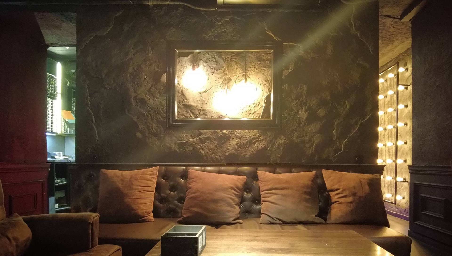 В интерьере были реализованы декоративные покрытия с эффектом имитации каменного рельефа. Стеновые поверхности выполнены в тёмных, приглушённых тонах, что усиливает ощущение глубины и изолированности пространства.